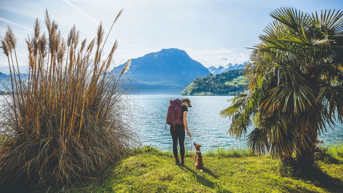 Der Frühling ist noch jung, die Wanderung ebenso. Kaum in Brünischart SZ aus dem Postauto ausgestiegen, wähnt man sich in südlicheren Gefilden. Frau und Hund geniessen sichtlich den Hauch Frische, die Ruhe, die Zweisamkeit. Ein Tessinmoment am Vierwaldstättersee, fotografiert von Fabienne Bregenzer.