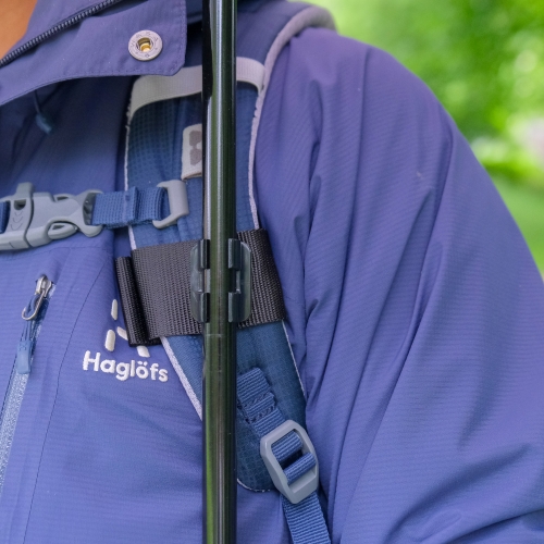 Der Glasfaserschaft des Trekkingschirms kann zweifach bis auf maximal 96 Zentimeter ausgezogen, in jeder Höhenposition festgestellt und auf die eigene Körpergrösse angepasst werden. Zusammengefaltet ist der «Telescope handsfree» 59 Zentimeter kurz und findet bequem im Rucksack Platz.
