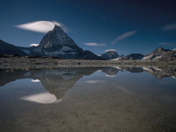 Eines von Simon Walthers Lieblingsbildern: das mit einer Wolkenfahne geschmückte Matterhorn bei Vollmond.