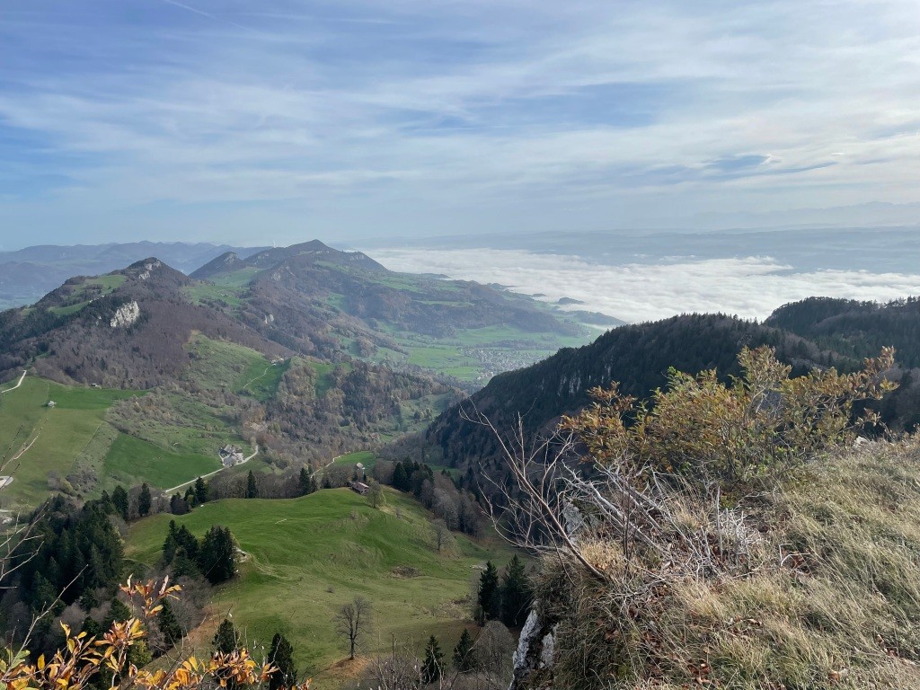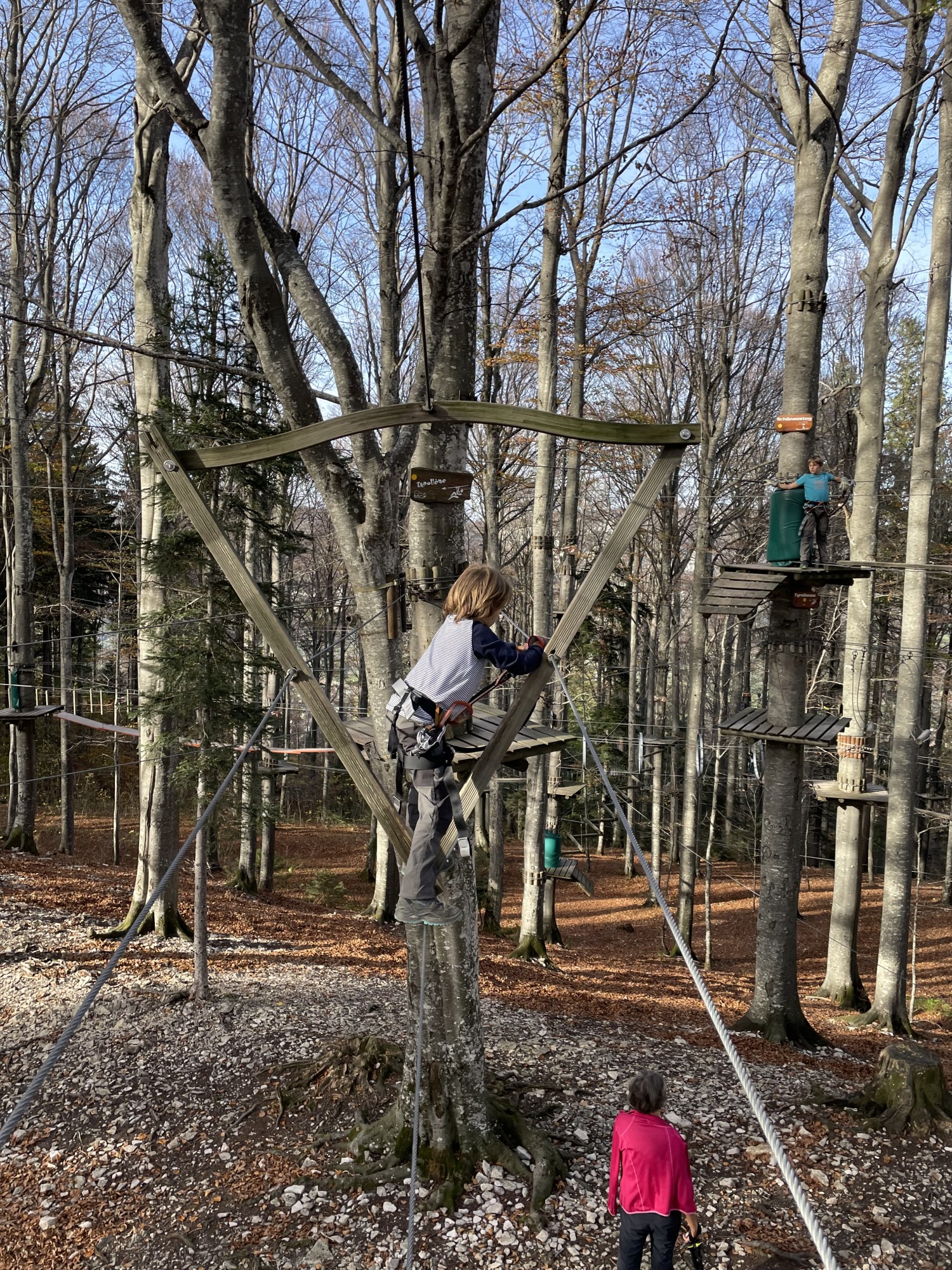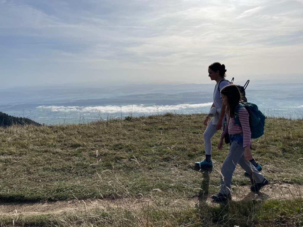 Beim Zmorge kommts, wie es kommen muss: Die Kinder wollen möglichst rasch in den Seilpark. Wandern? Nö, keine Lust. So geht es eben mit diesen Belohnungen, denke ich mir insgeheim. Auch die Cousine der Kinder findet, es reiche ihr mit Wandern. Und so kommen wir zwischen Gonfibrot und Müesli zum Schluss, dass ich alleine losziehen darf und die Cousine das Motivationscoaching meiner Kinder auf dem breiten Wanderweg nach Balmberg übernimmt. So steige ich erst auf die Röti, dann auf das Balmfluechöpfli, und meine Laune steigt mit jedem Höhenmeter gemütlichen Alleinwanderns. Im Wissen darum, dass die Kinder in diesem Moment noch ausgiebig Bildschirmzeit auskosten, habe ich hier mein eigenen Fern-Sehen: Eine Wolkendecke liegt über dem Mittelland, im Hintergrund sind die Alpengipfel zu erkennen, etwas diesig zwar, aber trotzdem schön. Ich peakfindere etwas, suche auf der Karte die Namen der Dörfer unter mir und zeichne eben besagtes Höhenmodell. Den Schluss der Kinder-Höhenkurve zeichne ich auch schon ein – eine Kristallkugel brauche ich dazu nicht – die Kurve führt steil hinauf. Und als ich schliesslich auf dem Balmberg ankomme, komme ich kaum mehr dazu, mein Zmittag zu essen, bevor ich herzklopfend über luftige Tritte balanciere und am Seil hängend eine Tyrolienne hinunterbrause – mit viel Kinderlachen im Ohr.