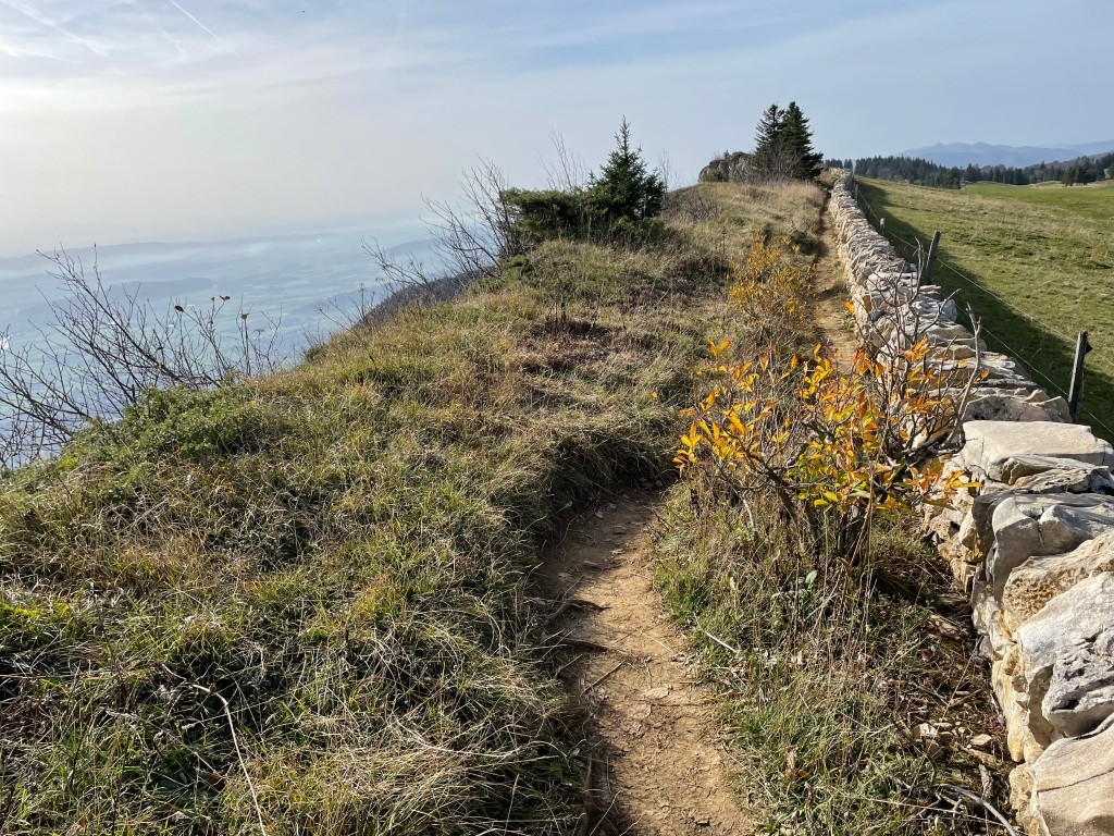 Mit Zug und Bus reisen wir auf den Untergrenchenberg, blicken sogar über ein kleines Wolkenmeer, wandern los (Höhenprofil der Wanderung = ausgezogene Linie). Mit der Cousine im Schlepptau ist das eine gute Sache, die Kinder geben sich keine Blösse und wandern tipptopp mit. Bald erreichen wir die Wandfluh, und diese imponiert den Kindern sehr. Der Weg führt direkt an der Fluh entlang, hat aber immer genügend Abstand zum Abgrund, damit das nicht gefährlich ist. Immer wieder fotografieren wir, seit der Lichterprinz einen Fotoapparat zum Geburtstag erhalten hat, verfügen nun alle über ein Gerätchen zum Fötelen. Er tut dies mit viel Freude und einer sehr eigenwilligen Wahl des Bildausschnittes.
