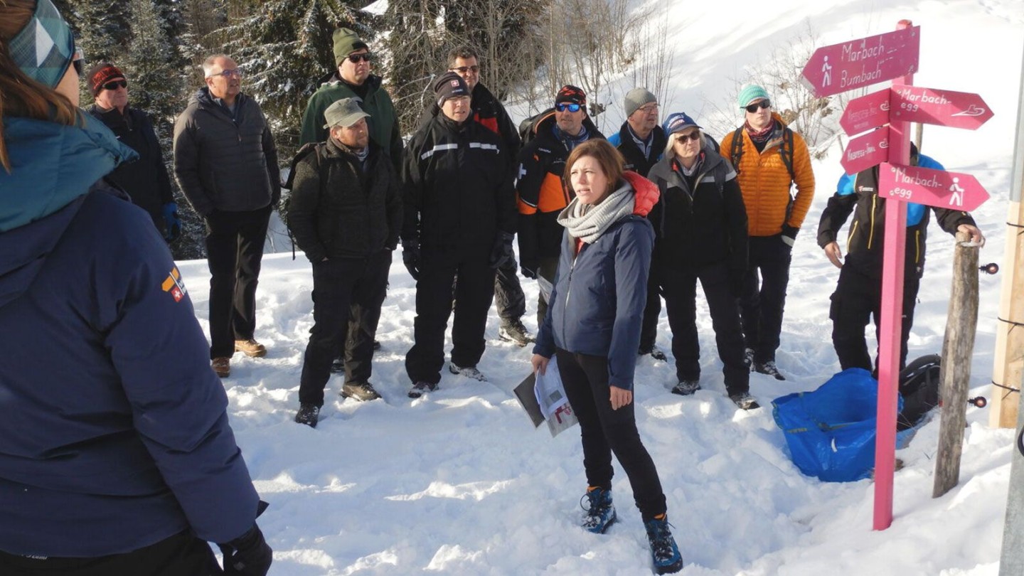Als Winterexpertin der Schweizer Wanderwege hat uns Dany auch Einblick in ihre Arbeit gegeben, zum Beispiel in die Winter-Fachexkursion, die sie organisiert hatte. Auf der Marbachegg diskutierte sie zusammen mit den Teilnehmenden «von lapidaren Anfragen über rechtliche Abklärungen bis hin zu kuriosen Fragestellungen», zum Beispiel ob signalisierte Winterwanderwege mit Hundeschlitten befahren werden dürfen (Antwort: «Ja, aber…»)