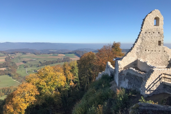 Schon bald nach Beginn der Wanderung auf der Buuseregg kann man zwischen den Bäumen hindurch die Ruine auf dem Farnsberg sehen. Mit dem Ziel vor Augen ist der kurze Aufstieg rasch geschafft. Ist man am höchsten Punkt angekommen, erstreckt sich vor einem eine wahre Spielwiese – die Oberi Weid. Aber die Kinder drängen zur Ruine, die nur wenige Schritte entfernt auf dem Felsen thront. Auf die mittelalterlichen Überreste der einst stattlichen Farnsburg kann man über eine verwunschene steinerne Wendeltreppe hinaufsteigen und sich dort oben wie ein Burgherr fühlen, der den Blick über seine Ländereien schweifen lässt oder Ausschau nach Burgräubern hält. Auch für die Erwachsenen ist der Ort interessant: Aus der Ruine der 1330 erbauten Burg ragt eine gewaltige Schildmauer, die sie in der Schweiz nahezu einzigartig macht. Nach der Eroberung der Ruine kann man auf der grossen Wiese picknicken, herumtollen und Drachen steigen lassen. Oder in Ruhe die wunderbare Aussicht geniessen. Der Abstieg nach Gelterkinden führt anfangs durch den herbstlichen Wald und ist auch weiter in Richtung Wohngebiet trotz einigen Abschnitten auf Asphalt idyllisch. Vom Aussichtspunkt auf der Höhe des Hofs Oberer Homberg lässt sich schon eine weitere Entdeckung erahnen, die so manches Pferdeliebhaberherz höherschlagen lässt und für den restlichen Weg bis zum Bahnhof noch einmal beflügelt.