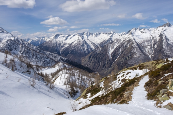 Diese Tour startet in Nante, allein schon deshalb, um sich mit dem Käse der Caseificio Togni einzudecken. Danach schlägt man den Winterwanderweg zur Mittelstation Pesciüm ein. Es geht zunächst auf einem Strässchen westlich bergwärts zur Siedlung Culiscio. Weiter geht es in gleicher Richtung unter der Seilbahn hindurch und auf einer Forststrasse durch Wald. Der Bach- graben des Riale dei Sassi wird gequert und nach einer ausladenden Kehre weiter oben ein zweites Mal, bevor der Weg die Höhenterrasse von Pesciüm erreicht. Hier biegt die Route in den Winterwanderweg nach rechts ein. Dieser folgt der Höhenlinie nach Westen, quasi dem Sentiero degli alpi, der im Sommer von Käsealp zu Käsealp führt. Er bietet einen grossartigen Blick zur Gotthardpassstrasse, zum Pizzo Lucendro, zum Pizzo Rotondo und zum Chüebodenhorn – stolze Gipfel über dem Bedrettotal. Schliesslich macht der Winterwanderweg einen grossen Schwenk ins Val Pozzuolo unter den eindrücklichen Wänden des Poncione di Vespero, um zur Weggabelung zurückzukehren, an der man sich rechts hält. Es geht leicht bergan, dann am Gehöft Cascina Nuova vorbei und über die kupierte Höhenterrasse im Auf und Ab zur Mittelstation der Seilbahn.