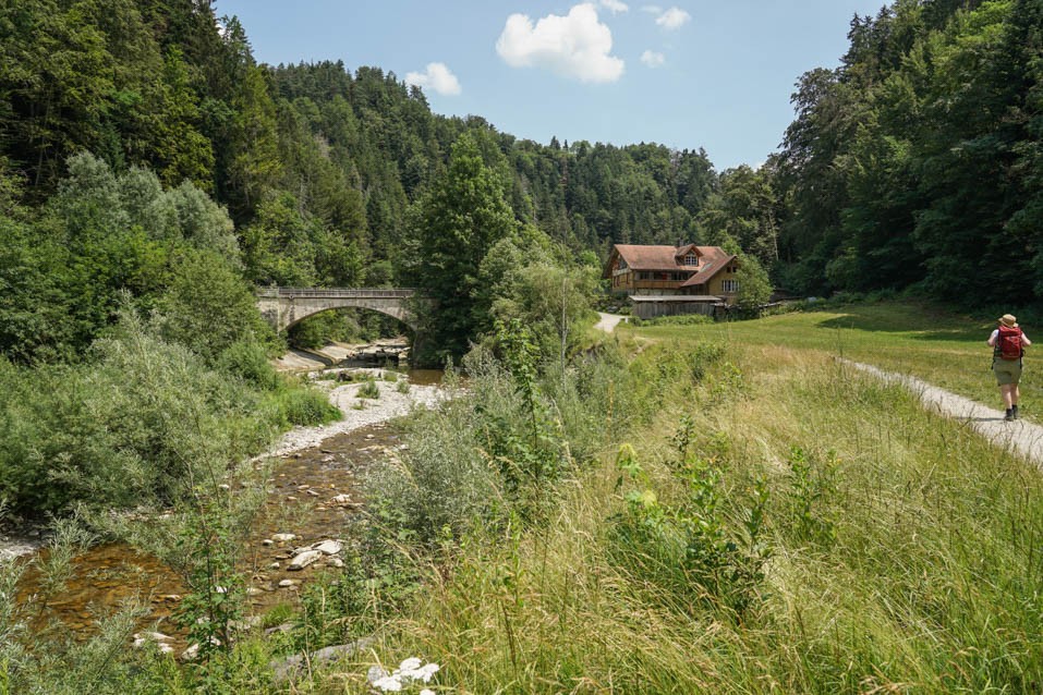 Guggisberg liegt idyllisch eingebettet zwischen saftigen grünen Wiesen. Gerade einmal 1700 Einwohner leben in der weitverzweigten Gemeinde, der Dorfkern mit der pittoresken Kirche ist überschaubar. Stündlich spuckt das Postauto ein paar Touristen aus, denn vor allem aus der nahen Stadt Bern ist Guggisberg ein beliebtes Ausflugsziel. Das bekannte Guggershörnli ein oft angesteuerter Aussichtspunkt. Für einmal soll aber der markante Fels links liegen gelassen werden: Am Friedhof vorbei steigt der Weg durch Wiesen ab bis Laubbach. Würde man hier der Teerstrasse nach rechts folgen, und in Hirschmatt links abbiegen, käme man zum Keltenhaus, wo jährlich Mitte August ein dreitägiges Keltenfest mit Bands und Handwerkskunst stattfindet. Der Wanderweg quert aber die Teerstrasse und steigt nun durch Wiesen an. Man passiert wie zufällig hingewürfelte Bauernhäuser und friedlich grasende Kühe. Nach einiger Zeit führt der Weg in den Schatten spendenden Wald. Die Vögel zwitschern, kein Motorenlärm stört die Stille, einzig Kuhglocken sind zu hören. Mitten im Wald gibt es nämlich eine grosse Lichtung, wo mehrere Kuhherden gesömmert werden. Erst bei Brönnti Egg öffnet sich die Sicht auf die Freiburger Alpen erneut - und auch hier, Kuhglockengebimmel von allen Seiten und mehrere Viehgatter, die bezwungen werden müssen. Nur Menschen sind keine zu sehen, diese machen sich hier rar. Der Weg steigt nun ziemlich steil durch Wiesen ab, er trifft unten im Tal bei Zollhaus auf die grosse Strasse, die von Plaffeien an den Schwarzsee führt und einen unmittelbar aus dem Kuhland zurück in die Realität befördert.