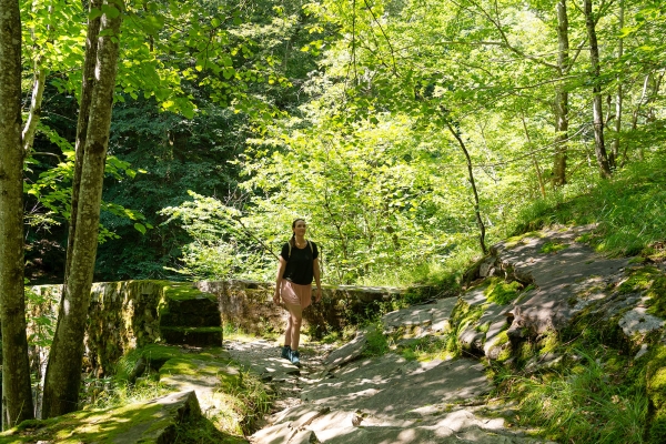 Es ist nicht überliefert, ob Napoleon wirklich einmal in dieser Ecke der Schweiz war. Bis heute erinnert jedoch ein bewaldeter, von Felsrippen durchzogener Hügel in der Form seines legendären Huts an ihn. Hier zeigt sich der Jura von seiner abwechslungsreichen Seite: Moorlandschaften, ausgedehnten Weiden mit mächtigen Fichten, die dem Wetter trotzen und den Weidetieren Schutz bieten und eine spannende Höhle. Der Wanderweg führt in Richtung La Vraconnaz einem sonnigen Hang entlang. Der Blick schweift über das Hochmoor Mouille de la Vraconnaz, das tiefer unten eingebettet in der Ebene liegt. Bald ist St-Olivier erreicht. Wer den Abstecher mit gleichem Hin- und Rückweg zur Höhle weglassen möchte, wandert von hier direkt nach La Côte-aux-Fées und verkürzt so die Wanderung um etwa 45 Minuten. Zur Höhle folgt man einem hölzernen Schild und dem Wegweiser Richtung Noirvaux. Beim Waldrand lädt eine offizielle Feuerstelle zum Bräteln ein. Ein steiler und mit Eisenketten gesicherter Pfad führt hinunter zum Eingang der Höhle Grottes aux Fées. Gebückt oder kriechend gelangt man zu einem Ausguck mitten in einer Felswand. Nach dem beschaulichen Dorf La Côte-aux-Fées folgen längere Abschnitte auf Asphalt. Erst beim Weiler Chez Juvet wird der Wanderweg wieder zum schmalen Pfad und führt einer felsdurchsetzten Krete entlang hinunter zum früheren Restaurant Chapeau de Napoléon. Von diesem Aussichtspunkt sieht man weit über das grüne Val de Travers. Im Nachmittagslicht wirft der Hügel einen hutförmigen Schatten über Fleurier. Später beim Blick zurück vom Bahnhof unten, ist gut nachvollziehbar, wie dieser Hügel zu seinem Namen gekommen ist. Doch zuerst wartet ein steiler Abstieg über Treppenstufen und Kalkgeröll, der Konzentration und Trittsicherheit erfordert.