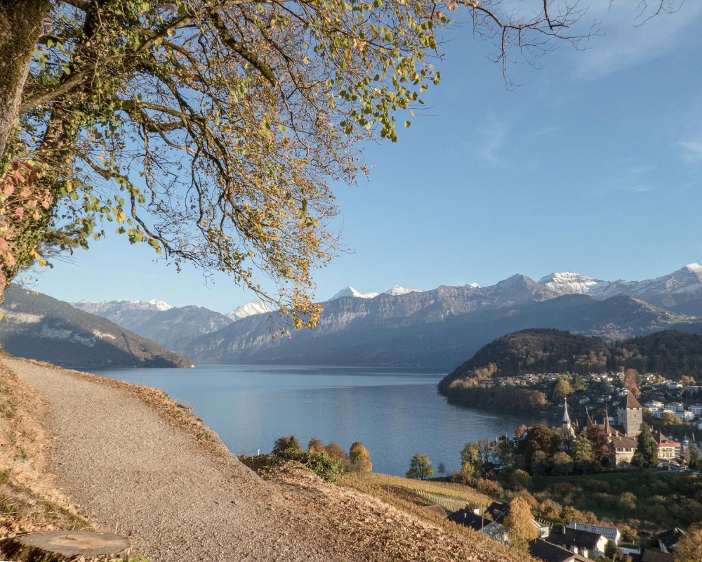 Avec une vue constante sur la triade Eiger, Mönch et Jungfrau, nous traversons la vieille ville de Thoune, passons devant le château de Schadau et l'église de Scherzlig et longeons le chemin de la plage à travers la zone de loisirs. Nous quittons ensuite le lac pour un court moment et traversons la Kander. Nous atteignons Einigen et son église, considérée comme l'église mère des douze églises millénaires du lac de Thoune. En passant par Moosegg et par la forêt de Spiezberg, nous arrivons dans les vignobles de Spiez, dont les vignes existent depuis plus de 1000 ans, puis nous descendons vers Spiez.