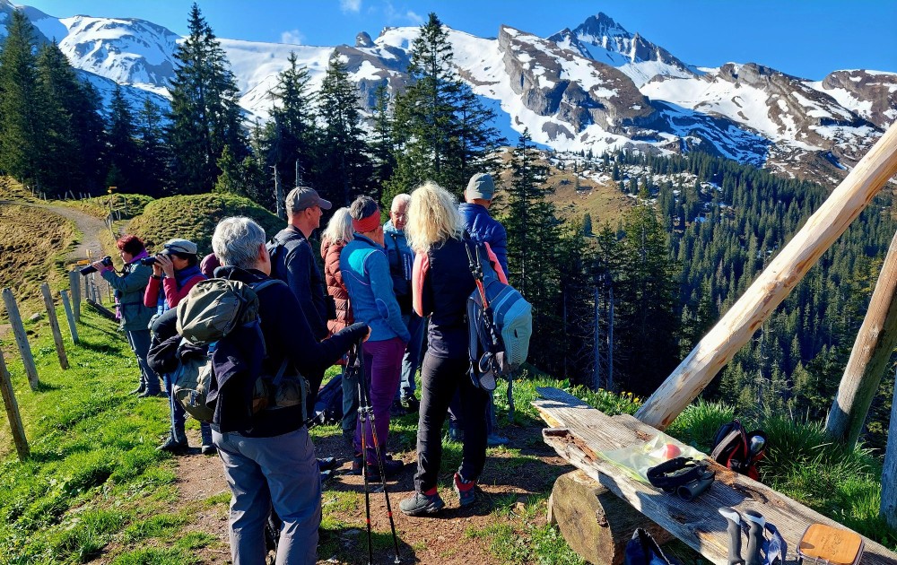 Valo Bütler begleitet uns als Ornithologe. Bärti Odermatt ist Autor der "Faszinierenden Lernlandschaft im Musenalp-Brisen-Gebiet" (PDF unter maria-rickenbach.ch), Ueli Amstad öffnet für uns die Alphütte Morschfeld. Abstieg auf eigene Faust (z.B. mit Luftseilbahn Musenalp-Niederrickenbach möglich.