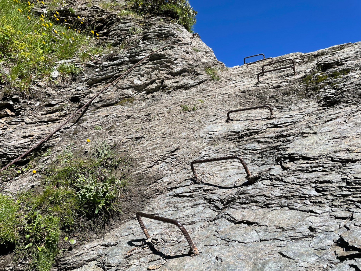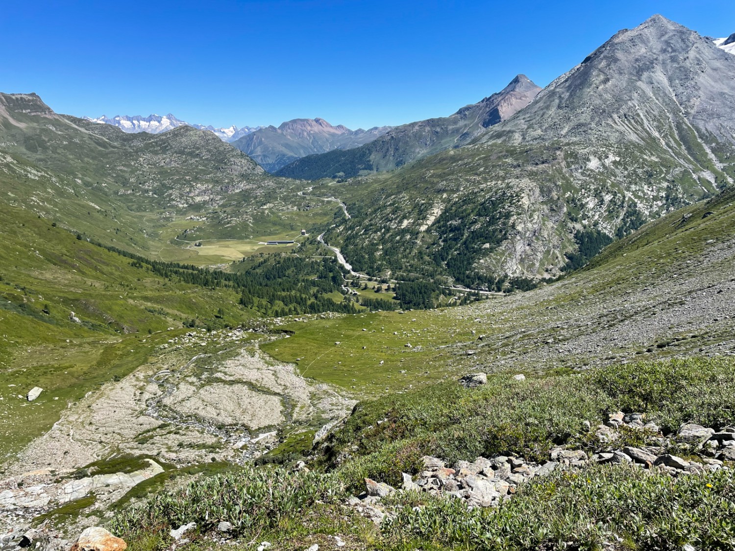 Immer etwa auf gleicher Höhe und mit prächtiger Sicht auf die Walliser Alpen geht es an der Südflanke des Hübschhorns entlang in Richtung Homatta, einer kleinen Alp hoch über der Passstrasse. Der schmale Weg führt durch lichte Lärchenwälder und dichten Wachholder, bis er in eine Schotterpiste mündet, die offenbar einst für den Bau von Lawinenschutzwällen angelegt worden ist. Bei Homatta zeigt der Wegweiser in Richtung Hobielestafel, von wo aus es steil hinunter nach Simplon Dorf geht. Wer allerdings die uralten Lärchen im Hittuwald bestaunen möchte, nimmt auf halber Höhe nicht den direkten Weg ins Dorf, sondern folgt dem Panoramaweg und nach drei Serpentinen der Suone Chrummbacheri bis zur Passstrasse. Von hier ist es nur noch ein kurzes Stück auf Asphalt bis in Dorfzentrum.
