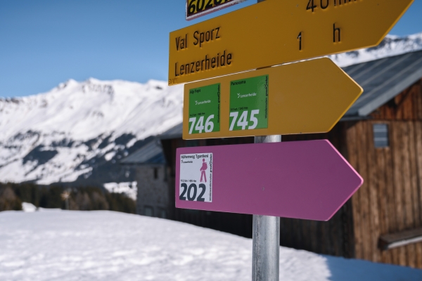 Beim Sportgeschäft Baselgia in Lenzerheide werden Schneeschuhleiter vermittelt und Schneeschuhe vermietet. Wer mag, kann die Schneeschuhe gleich anziehen und dem Bach Aura da Sanaspans entlang zum Startpunkt dieser Runde loswandern: der findet sich unten am Skihang. Von dort führt die Route parallel zum Skilift den Hang hoch. Den stillen Winterzauber geniessend, wandert man den Hang entlang Richtung Badagnis, dort führt die Route stets der Waldgrenze entlang zum einstigen Maiensäss Sporz. Kurz vor Sporz wendet der Schneeschuhtrail bereits, und es geht weiter Richtung Sporz Davains und dann ein wenig abwährt ins Val Sporz. Man wähnt sich fast in Kanada zwischen den verträumte Waldstücken und Lichtungen und geniesse die Eindrücke, bevor der (ab Winter 2009/10 markierte) Weg zum Ausgangspunkt zurückführt. Wer eine längere (nicht eingezeichnete) Variante vorzieht, tut dies am besten unter fachkundiger Leitung und nur bei ausgezeichneten Kartenlesefähigkeiten auf eigene Faust. Die Modellroute startet beim Skilift, führt direkt hoch nach Sporz, dann über Mandeschs und mit Orientierungssinn nach Porclas. Gerät man zu fest nach Westen steht man plötzlich über einem ausgeprägten Felsband. Spätestens dort mehr nördlich durch Waldpartien hinauf zum Wegweiser bei Punkt 1816 m gehen. Ab hier gibts zwei Varianten zur Alp Fops. Entweder dem Sommerweg folgend auf direktem Weg oder höher über den «Lawinenstein». Hier öffnet sich der Blick auf Parpaner-, Aroser- und Lenzerhorn, und kurz danach hat man die ganze Skiarena von Lenzerheide vor sich, wo der Hunger bei Donat Malär's Bündner Spezialitäten in der Alphütte am Pistenrand gestillt werden kann, bevor es abseits vom Skirummel nach Lenzerheide hinuntergeht.