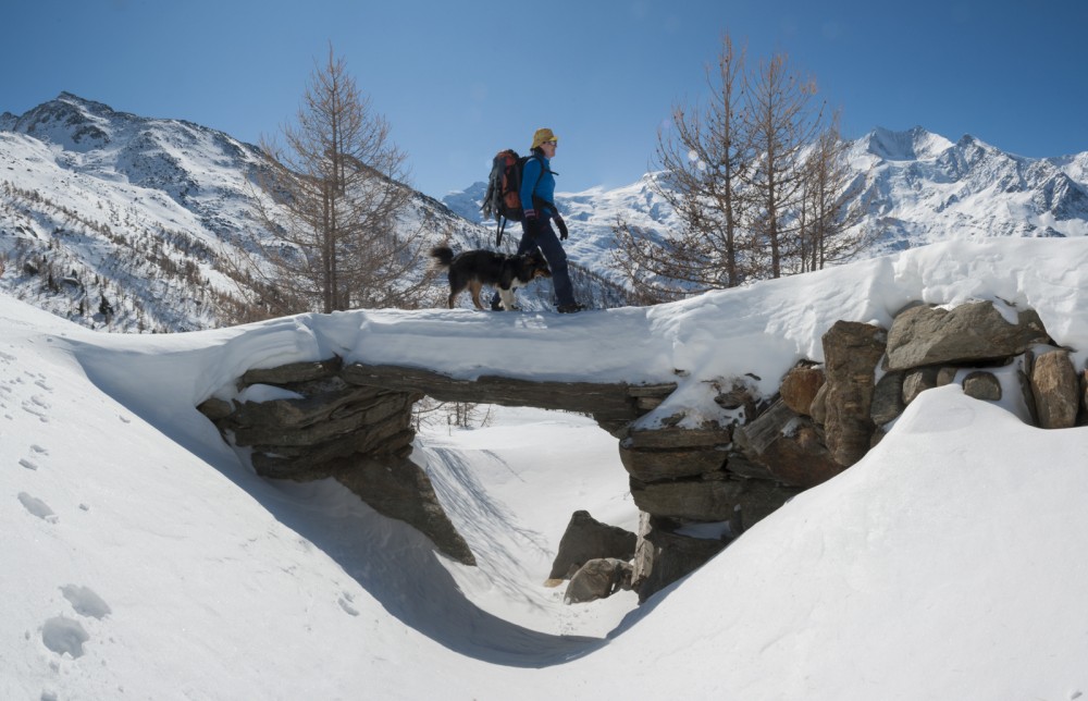 Auf dieser Schneeschuhtour, die zwei Trails miteinander verbindet, gibt es dank der Lage von Rosswald gleich dreimal Gelegenheit zum Einkehren: Am Anfang, dann gleich nach der ersten Runde und ganz am Schluss nochmals. Der obere Schneeschuhtrail führt ausgehend vom Informationsbüro Rosswald zwischen den Chalets am Rand der Piste entlang aufwärts. Beim Parkplatz des Restaurants stapft man bis zu dessen Ende und folgt dem Trail in den Wald hinein. Höher oben kommt man an einer kleinen Kapelle vorbei, deren Türe im Winter zwischen den Schneewänden fast nicht mehr zugänglich ist. Nach den letzten Chalets führt die Route in den stillen Saflischwald, wo Pistenbetrieb und Häuser weit weg scheinen. Ohne Spuren von Vorgängern wäre der richtige Pfad im frisch verschneiten Wald nur schwer zu finden. An mächtigen Lärchen vorbeigehend, gewinnt man weiter an Höhe. Aus dem Wald aufgetaucht, ist der höchste Punkt der Schneeschuhwanderung auf etwa 2040 Metern erreicht. Am rechten Rand der blauen Piste geht es wieder abwärts. Bei schönem Wetter bietet der Abstieg eine wunderschöne Aussicht zu den Berner und Walliser Gipfeln. Wer nach eineinhalb bis zwei Stunden gerne noch weiter wandert, macht auch noch den unteren Zirkel, der etwa gleich lang ist. An der Bergstation der Luftseilbahn und der Steinhütte vorbei, wandert man in Richtung Resti. Vor sich ragen die verschneiten Gipfel der Simplonregion in den Himmel. Von der Alp Resti führen die pinken Markierungen abwärts bis auf die Forststrasse, der man bis zur Abzweigung «36-Weg» folgt. Zurück auf einem schmalen Pfad führt der Trail durch verschneiten Wald aufwärts und zurück nach Rosswald. Wie wäre es jetzt mit einem heissen Getränk zum Aufwärmen?