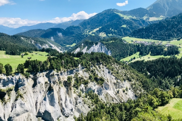Diese Wanderung führt in eine Welt, die von den Naturgewalten des Wassers und der Geröllströme geprägt ist, die das Val S-charl durchziehen. Hier zeigen sich die Folgen von Unwettern mit starken Niederschlägen. Nach den letzten Häusern von Scuol und Vulpera taucht man in eine wilde Naturlandschaft. Im tief eingeschnittenen Bachbett kommt das Wasserrauschen besonders laut zur Geltung. Riesige Blöcke im Wasser, verkeilte Baumstämme und unterspülte Ufer zeugen von den enormen Wassermassen, die bei Unwetter hier durchtosen. Vom schmalen, stellenweise mit Ketten gesicherten Pfad aus erlebt man hautnah die Kraft des Wassers. Ein steiler Aufstieg führt vom Bachbett hoch zum Strässchen nach S-charl, das von eindrücklichen Schuttströmen gesäumt ist. Diese Geröllmassen werden von den brüchigen Dolomitgipfeln heruntergewaschen. Nach jedem starken Niederschlag muss die Strasse wieder freigebaggert werden. Bei Pradatsch verlässt der Wanderweg die Strasse und führt als kleiner Pfad durch eindrücklichen, moosreichen Bergwald. Der letzte Wegabschnitt auf der Schotterstrasse führt am Bergbau- und Bärenmuseum Schmelzra vorbei, das vom Blei- und Silberabbau im Tal zeugt und an den Braunbären Lumpaz erinnert, der 2005 die Gegend durchstreifte.